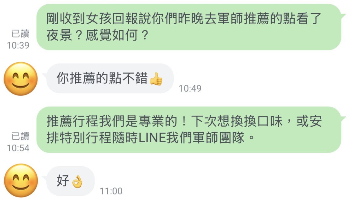 這位客戶剛結束一場完美的體驗,就迫不及待想嘗試下一種風格。無論是知性、活潑還是可愛型,只要你開口,軍師絕對幫你精準匹配到最合拍的她。