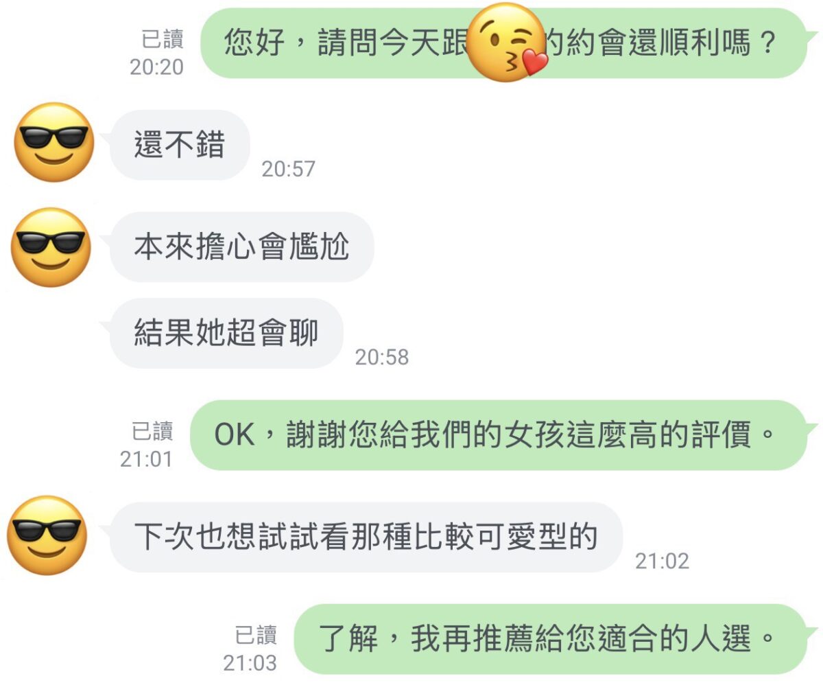 看到女孩回報、客戶滿意,這就是我們最在乎的事。從挑選對象到推薦景點,我們一條龍為你把關,讓你只需要帶著放鬆的心情,去享受那段心動時光。